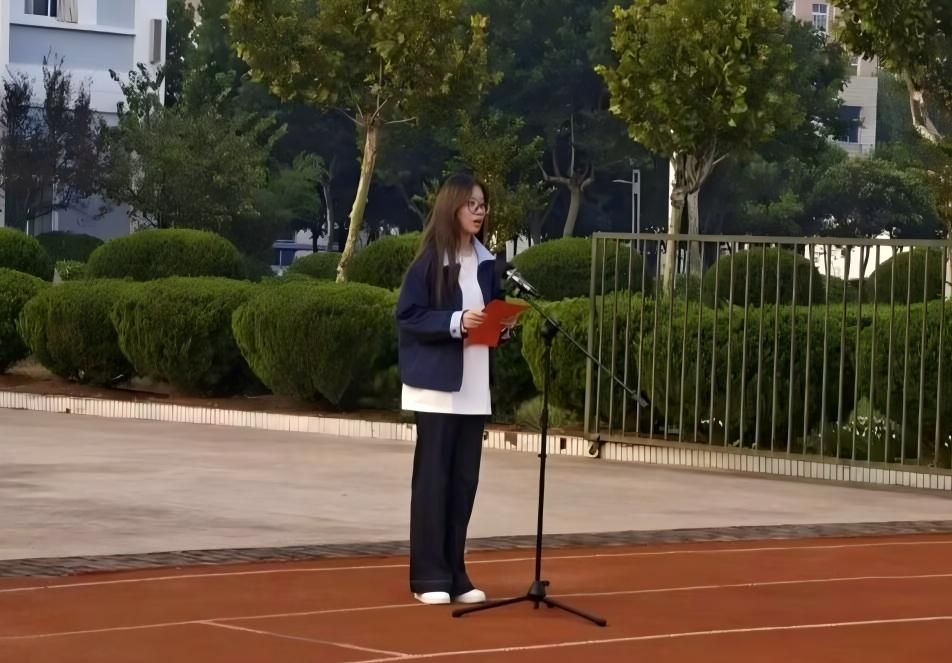 在迎风飘扬的国旗下,财务3232班谢雨婷作为员工代表发言。她以“爱国在新时代的模样”为主题,从历史到现实,从理想到实践,深刻阐释了新时代青年践行爱国主义精神的路径:一要立鸿鹄之志,将个人理想融入国家发展大局;二要练就过硬本领,以真才实学服务国家建设;三要勇于担当作为,在实际行动中展现青春力量。