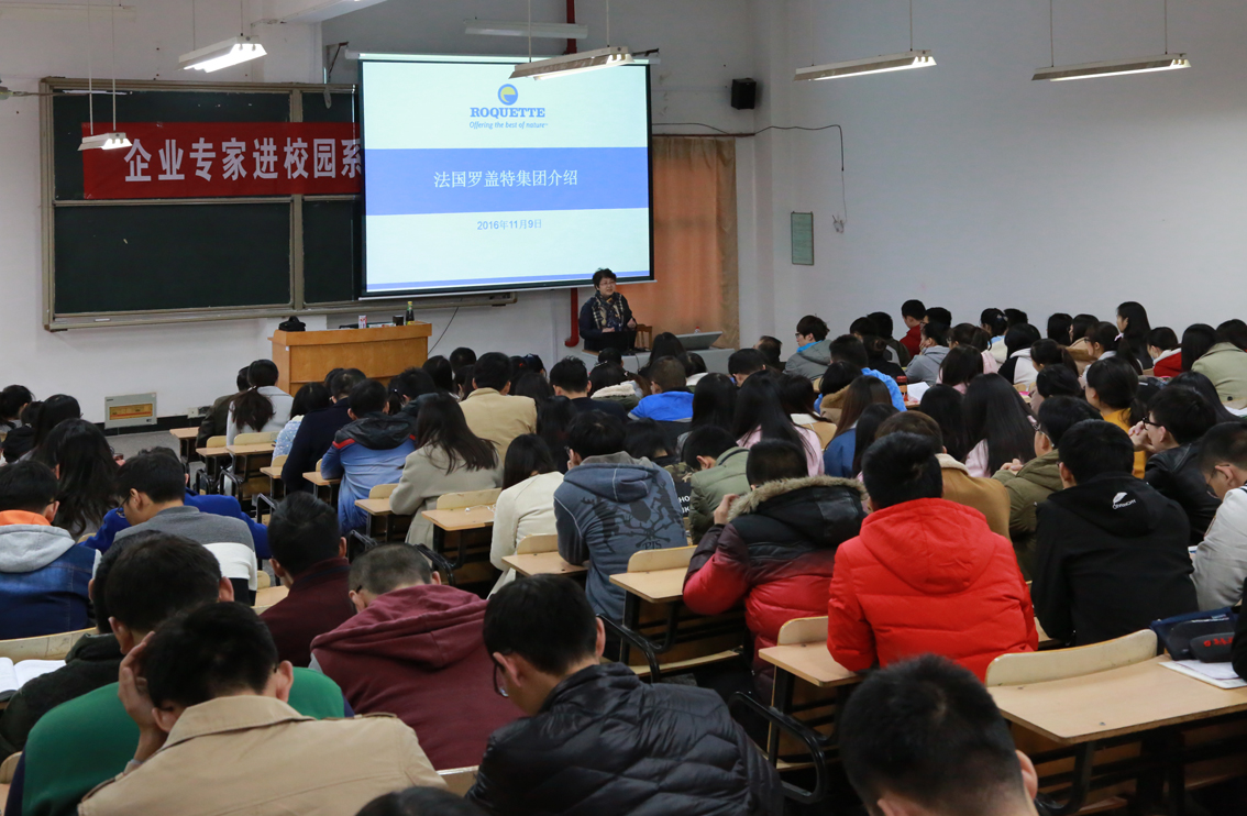 樊经理对各位专家进行了介绍,对他们的到来表达了热烈欢迎。讲座开始,张部长用轻松幽默的方式,对罗盖特集团的创始和历史发展进行了介绍。其次,由张部长特别邀请到场的企业权威专家李经理为同学们详细讲述了企业详情。李经理先从连云港工厂的发展过程和覆盖范围讲起,详细讲解了关于“玉米转化为淀粉再到液体粉木糖醇”的生产过程,对企业的产品在营养健康和医学上的实际应用举例说明,并提出问题。现场同学们讨论热烈,气氛非常活跃。最后,张部长阐述了企业的社会责任,分析了该企业可以长期强大发展的原因并对同学们的毕业形势做了具体分析,给出中肯建议,赢得了同学们的阵阵掌声。