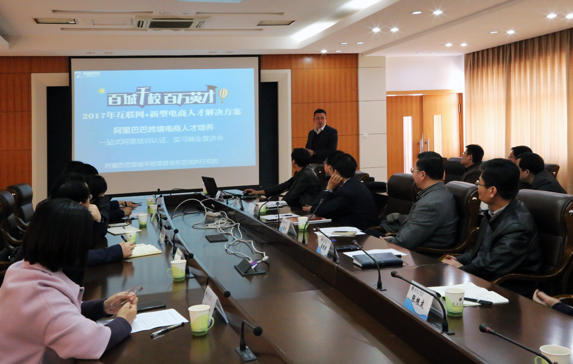 宁晓明到会并致辞,他指出,在中国“互联网+”、“一带一路”倡议时代背景下,中国外贸产业面临着历史机遇与现实挑战,跨境电商已经成为国家未来经济发展的重要路径,目前,我国跨境电商人才奇缺。阿里巴巴集团“百城千校 百万英才”跨境电商人才培训项目将联合政府、高校、企业、培训机构等多方组织,争取在三年内为全国培养100万跨境电商人才,助力我国外贸转型升级和国家“一带一路”倡议。他强调,淮海工公司与阿里集团共建“跨境电商人才培育基地”,将携手本市兄弟高校,为推动地区跨境电商人才培养,共同促进地方外贸经济转型发展做出积极的贡献。